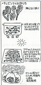 カタクリ、クサギ、スベリヒユ、ゼンマイ、フキノトウ、ヨモギ、ワラビなど。 <乾燥法の一例・干しゼンマイの作り方>