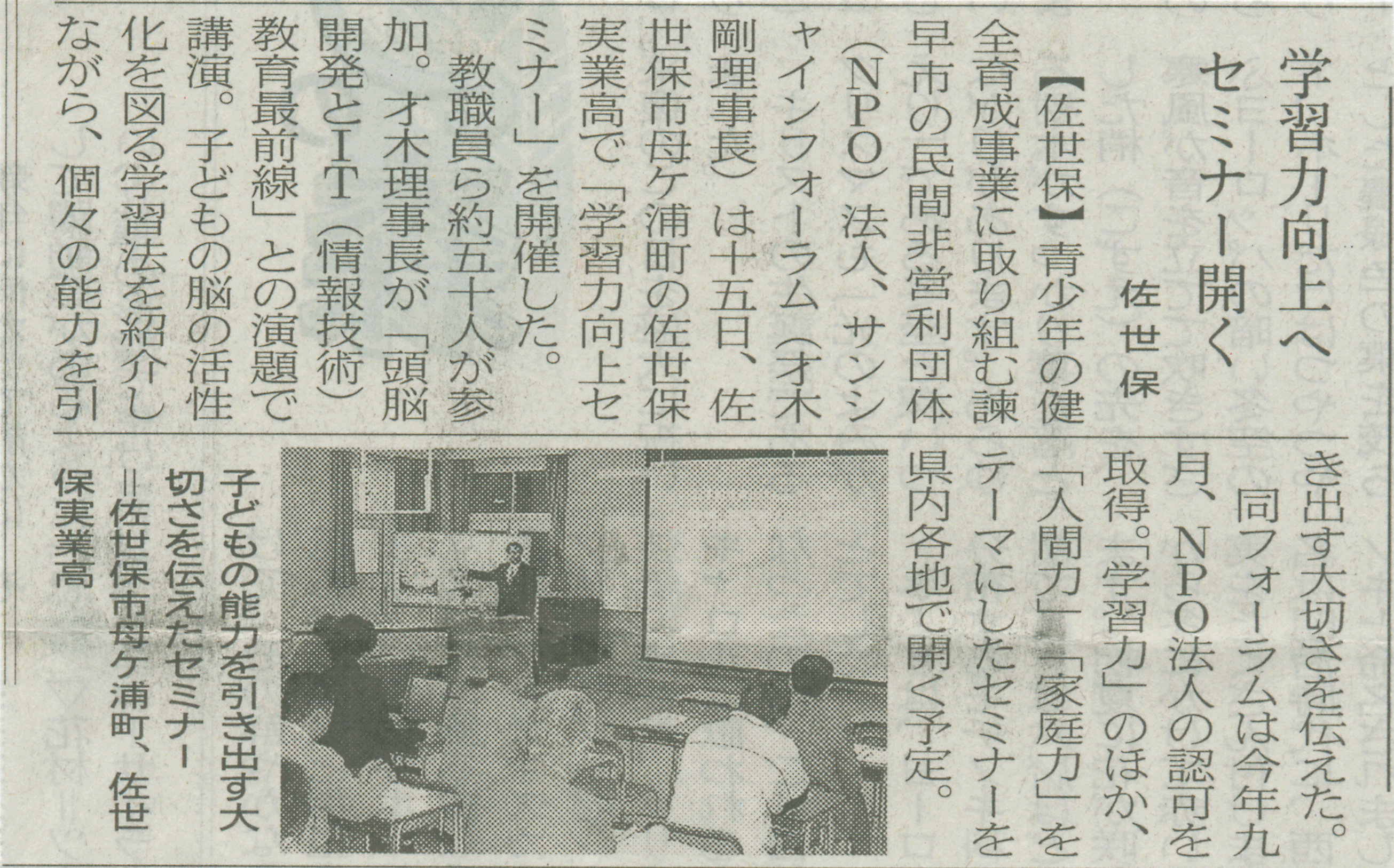 下の新聞は翌日の長崎新聞朝刊に掲載されたセミナーの実施を紹介する記事です。記事の内容は次の通りです。『学習力向上へセミナー開く 佐世保 【佐世保】青少年の健全育成事業に取り組む諫早市の民間非営利団体(NPO)法人、サンシャインフォーラム(才木剛理事長)は15日、佐世保市母ケ浦町の佐世保実業高で「学習力向上セミナー」を開催した。